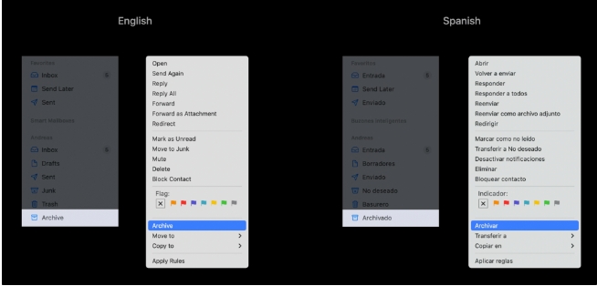 → 영어로 앱을 실행하는 동안은 동일한 단어가 표시되고, 스페인 번역기는 다른 단어를 제공할 수 있게 되었다. 즉, Archive라는 단어를 두개의 키로 분리해서 (archive.menuitem, archive.label) 관리하여 각 번역기가 다른 형태를 저장할 수 있도록 설정한다.