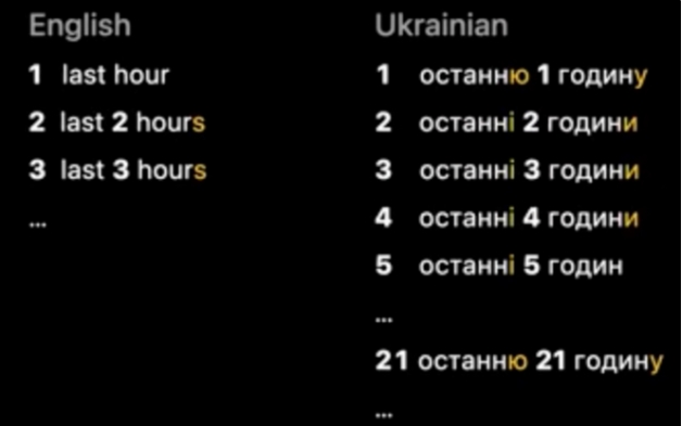 image String(localized: "\(amountOfRain) in last \(numberOfHours) hour", comment: "Label showing how much rain has fallen in the last number of hours")영어와 우크라이나어의 복수형