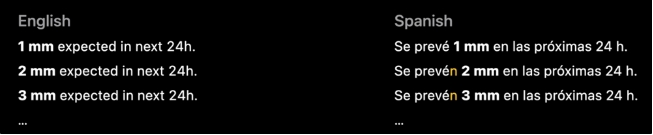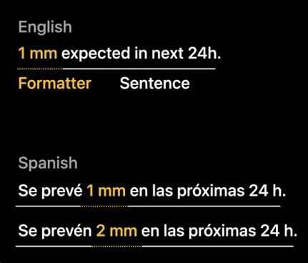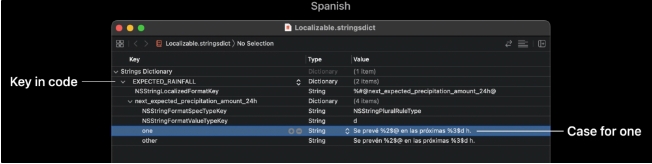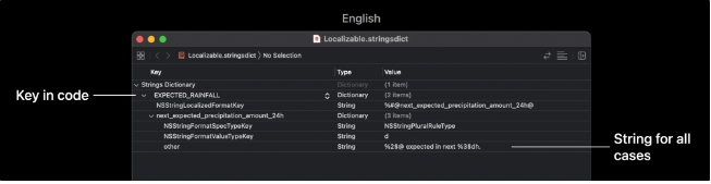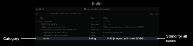 func expectedPrecipitationIn24Hours(for valueInMillimeters: Measurement<UnitLength>) -> String { // 시스템에 UnitLength를 요청한다. // 사용자 설정을 암호화하고, 강우를 보여주는 것을 요청한다. let preferredUnit = UnitLength(forLocale: .current, usafe: .rainfall) // 사용자가 미터법을 사용하도록 설정하지 않았다면, 측정 타입을 선호화는 단위로 변환한다. let valueInPreferredSystem = valueInMillimeters.converted(to: preferredUnit) // API 구성은 우리가 그 값에 대한 형식화된 문자열을 코드 한 줄로 생성할 수 있게 해 준다. let formattedValue = valueInPreferredSystem.formatted(.measurement(width: .narrow, usage: .asProvided)) // 비가 1mm나 1인치를 초과해서 내린다면, 복수형을 써야한다. 값을 정수로 변환해서 확인할 수 있게 한다. let intergerValue = Int(valueInPreferredSystem.value.rounded()) // localized 문자열을 주어진 키로 로딩하고 default value도 설정한다. default value에서 String interpolation을 써서, integerValue와 형식화된 값과, 숫자 24를 포함시킨다. 올바른 숫자 체계가 자동으로 쓰이게 된다. 키는 stringdict에 선언되게 된다. return String(localized: "EXPECTED_RAINFALL" defaultValue: "\(integerValue) \(formatterValue) expected in next \(24)h.", comment: "Label - How much precipitation (2nd formatted value, in mm or Inches) is expected in the next 24hours (3rd, always 24).")2단계 : String dict 생성