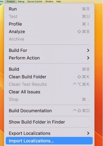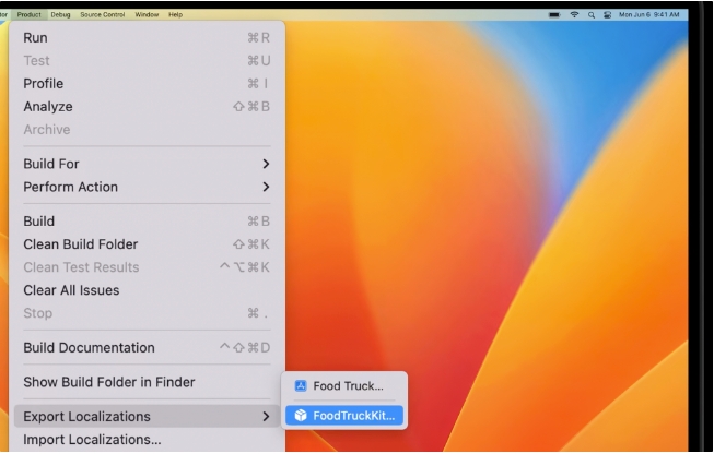 xcloc파일(번역기로 전송되는 파일)에 들어간다.Xcode - Produce - Exprot Localizations - FoodTruckKit Export