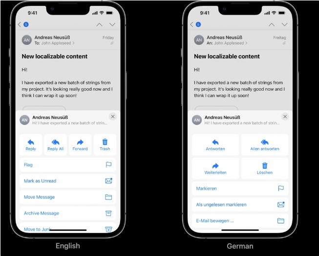 // WARNING!! let locationName = "Cupertino" // 도시 // or let locationName = "My Location" // 단순 대명사 let showWeatherUserActivityTitle = String( localized: "Show weather in \(locationName)", comment: "Title for a user activity to show weather at a specific city or \"my location\""// 독일어 - 쿠퍼티노 날씨 보여줘 "Wetter **in** Cupertino anzeigen" // Ok // 독일어 - 현재 위치의 날씨를 보여줘 "Wetter in meinum Standort anzeigen" // NO "Wetter **an** meinum Standort anzeigen" // OK